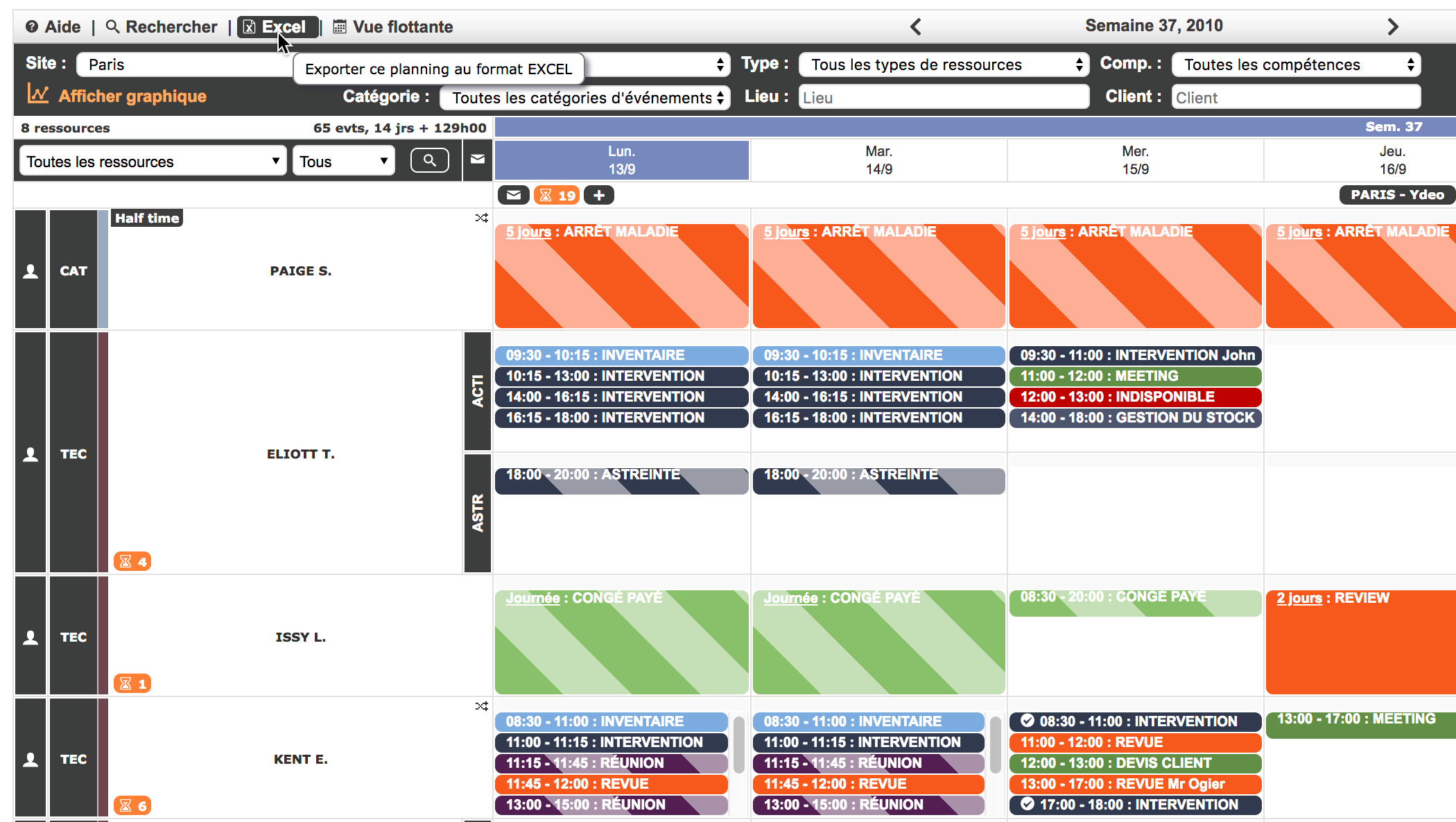 Vous gardez ainsi tous les avantages d'un planning de travail mutualisé et accessible depuis Internet, tout en gardant la possibilité d'exporter un planning Excel de l'activité et des congés de votre personnel.