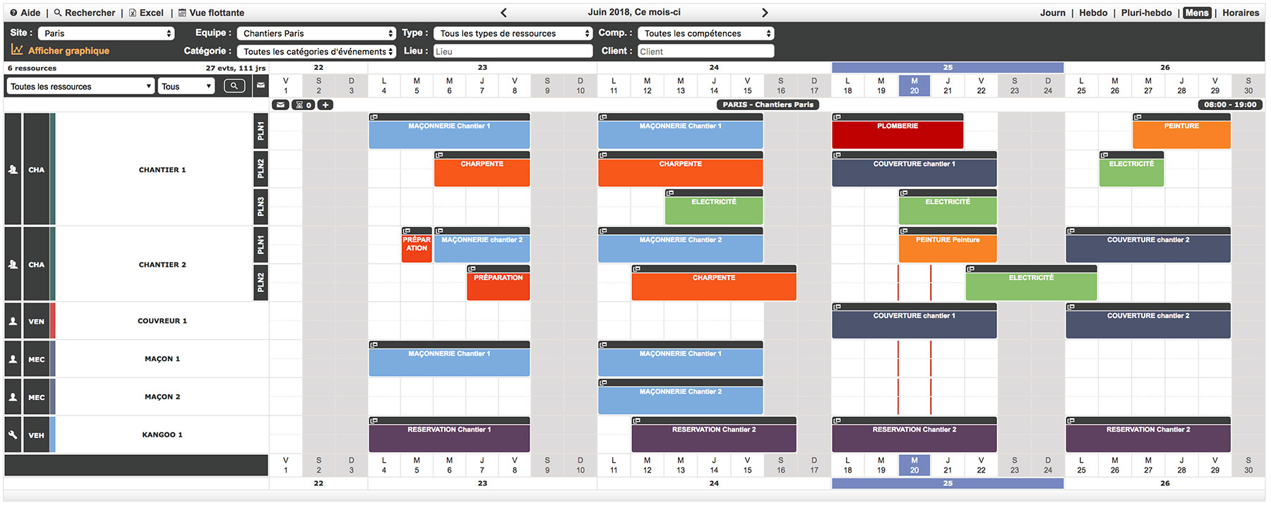 Planning de chantier, planning de réservation de véhicules et de matériel